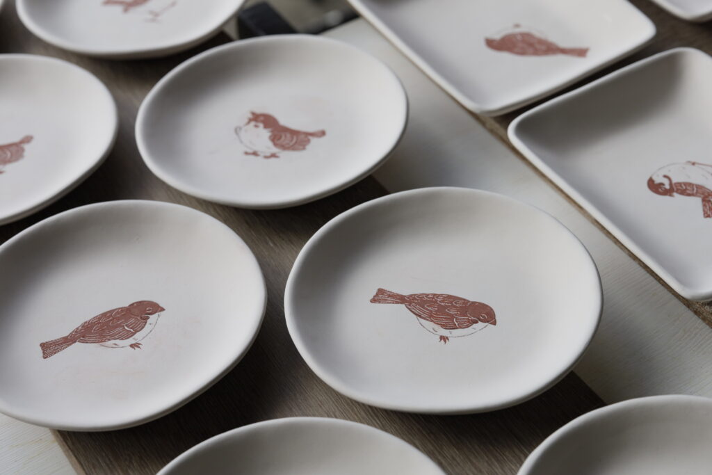 昨日の素焼きの窯出しをして、マグカップにもこれから絵付けをしていきます。